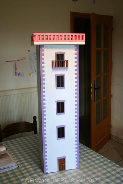 Tour à CD version phare. Les petites briques mauves sont découpées dans du balsa, ainsi que le balcon. La poignée de la porte est modelé en zinc. (co-réalisation avec Peggy Caufourier)